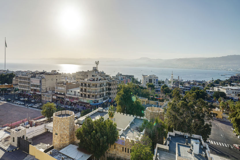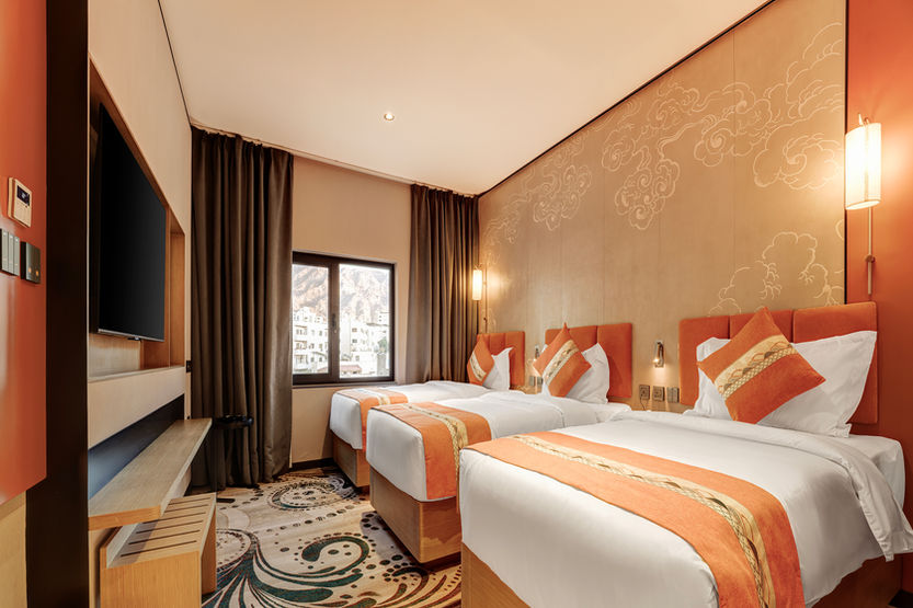 Configured specifically for three guests, this 30 m² room offers a practical layout with three single beds. Large windows frame views of Aqaba’s sandstone mountains and the city, while soundproof walls ensure a peaceful stay. The air-conditioned room features a flat-screen TV with streaming services, a minibar, and a tea and coffee maker.