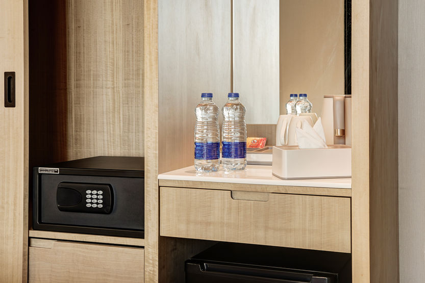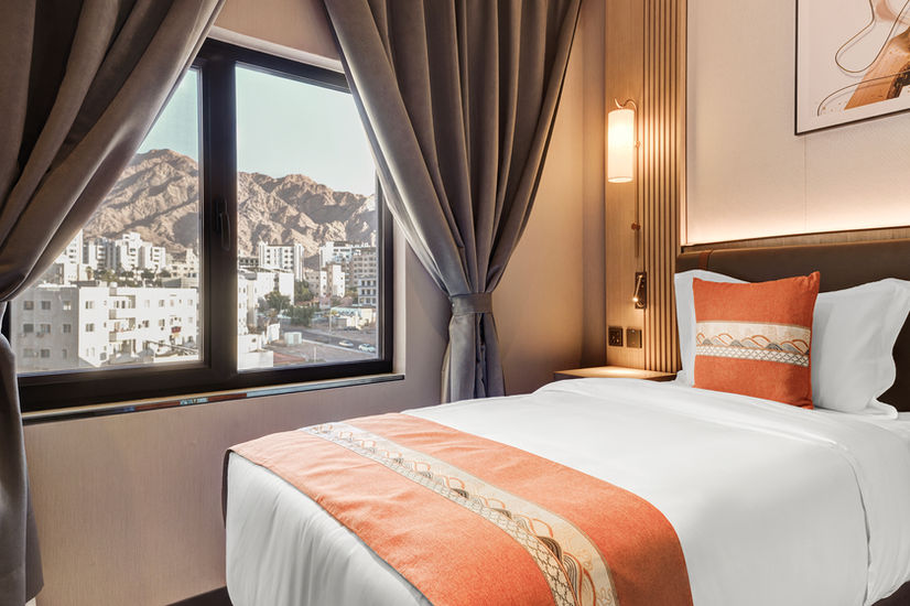 A practical and comfortable option for business or short leisure stays, this 25 m² twin room features two single beds and a quiet mountain-facing orientation. Large windows frame views of Aqaba’s sandstone mountains and the city, while soundproof walls ensure a peaceful stay. The air-conditioned room features a flat screen TV with streaming services, a minibar, and a tea and coffee maker.
